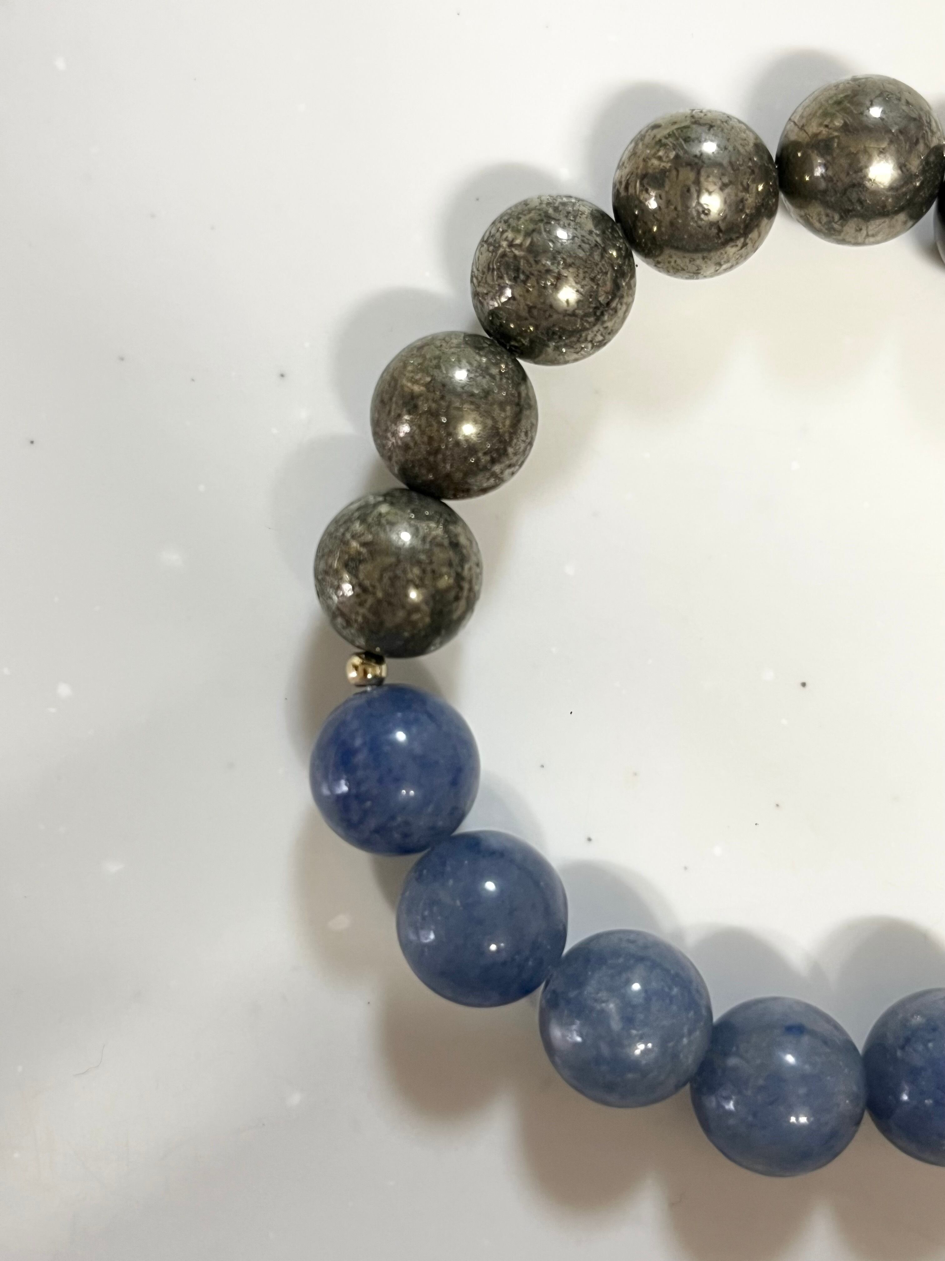 このブレスレットは、ゴールデンパイライトとブルークオーツ、さらにはエボニーを使用しており、海の青と月の輝きをイメージしたデザインが魅力です。身に着けることで、毎日の生活に特別なエネルギーを与え、自分自身を委ねて進む力を呼び起こしてくれることでしょう。
