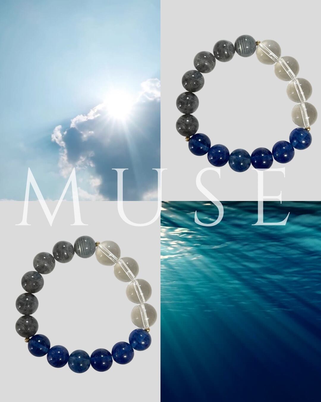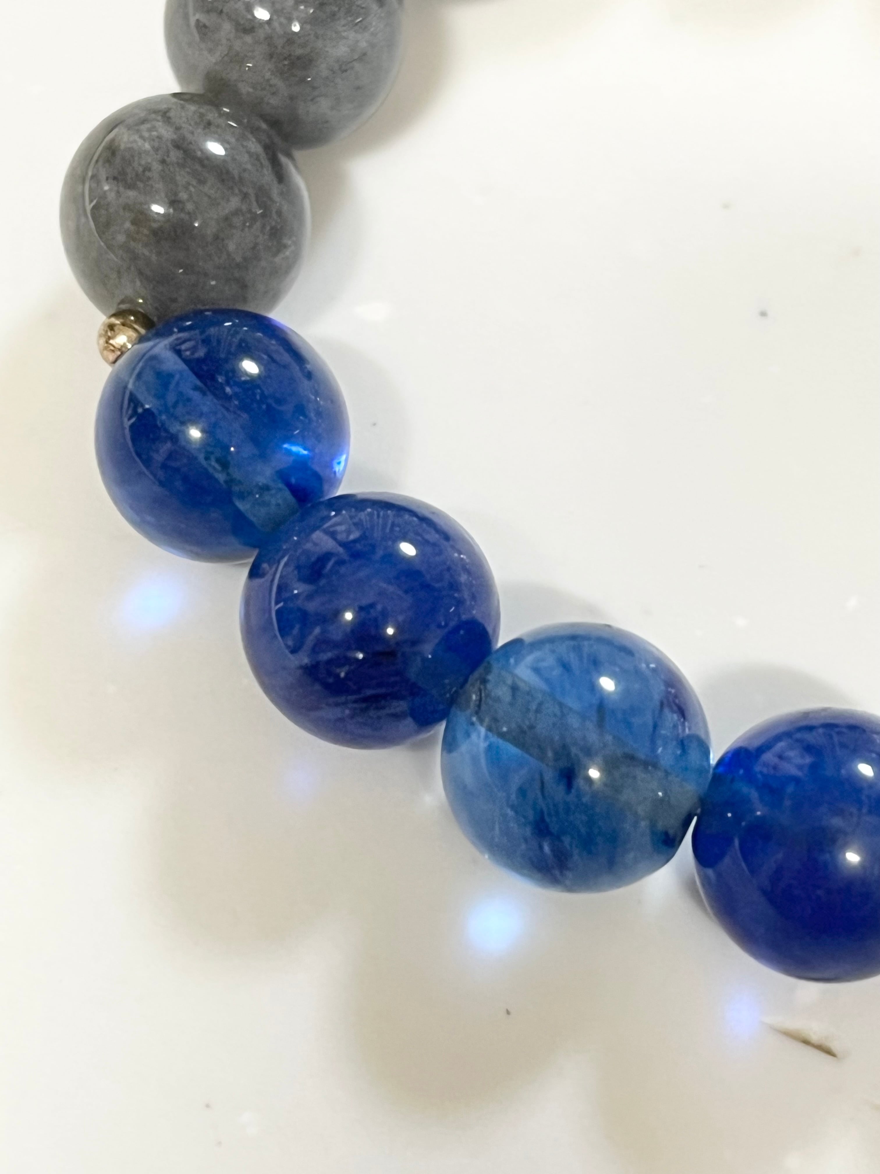 このブレスレットは、ラブラドライト、ブルーベリークォーツ、そして水晶を使用しています。海の深い青と雲の軽やかさを表現したデザインが魅力で、身に着けることで日常生活に特別なエネルギーを取り入れることができるでしょう。心がほどけて、晴れる瞬間を楽しむことができます。