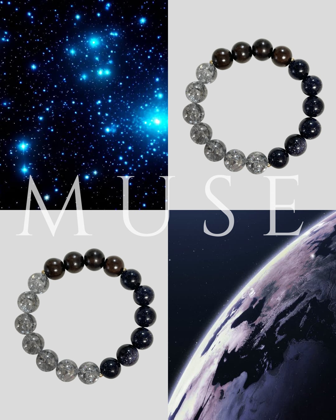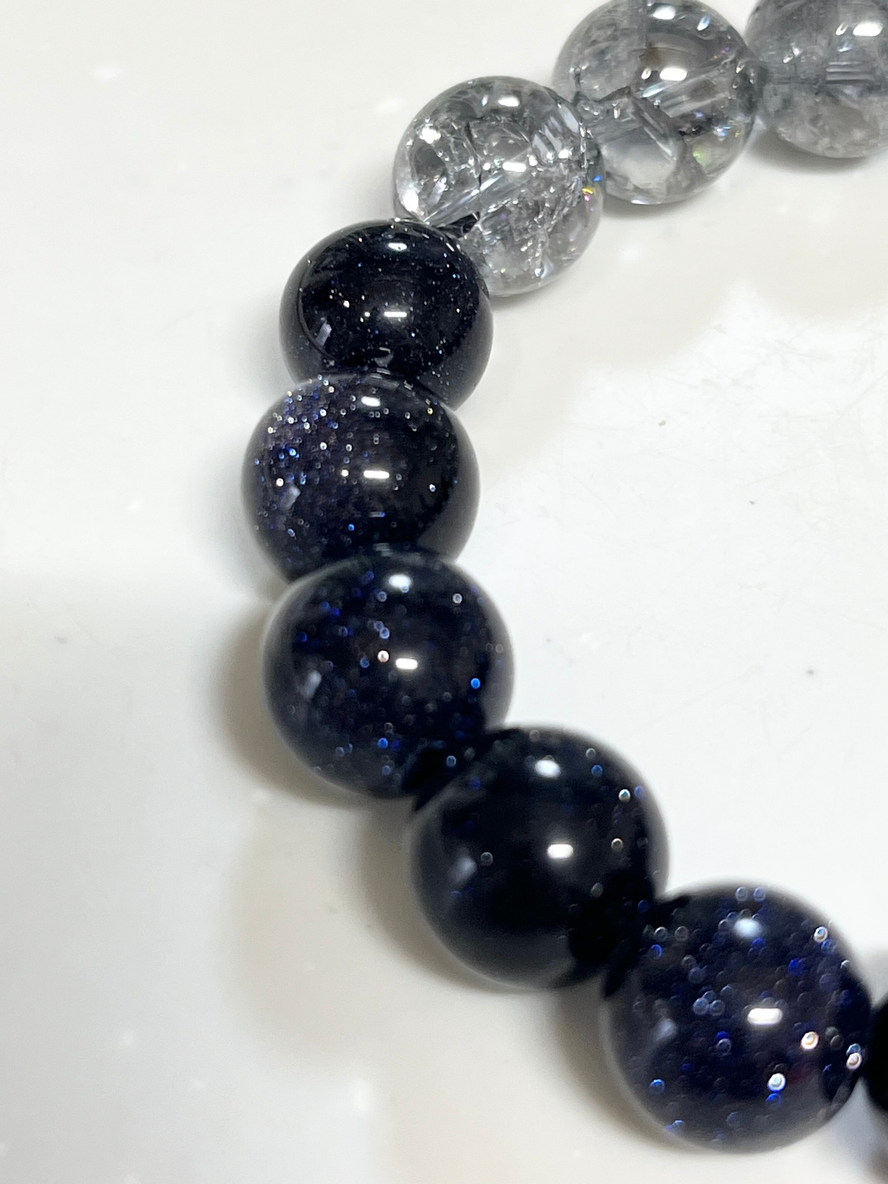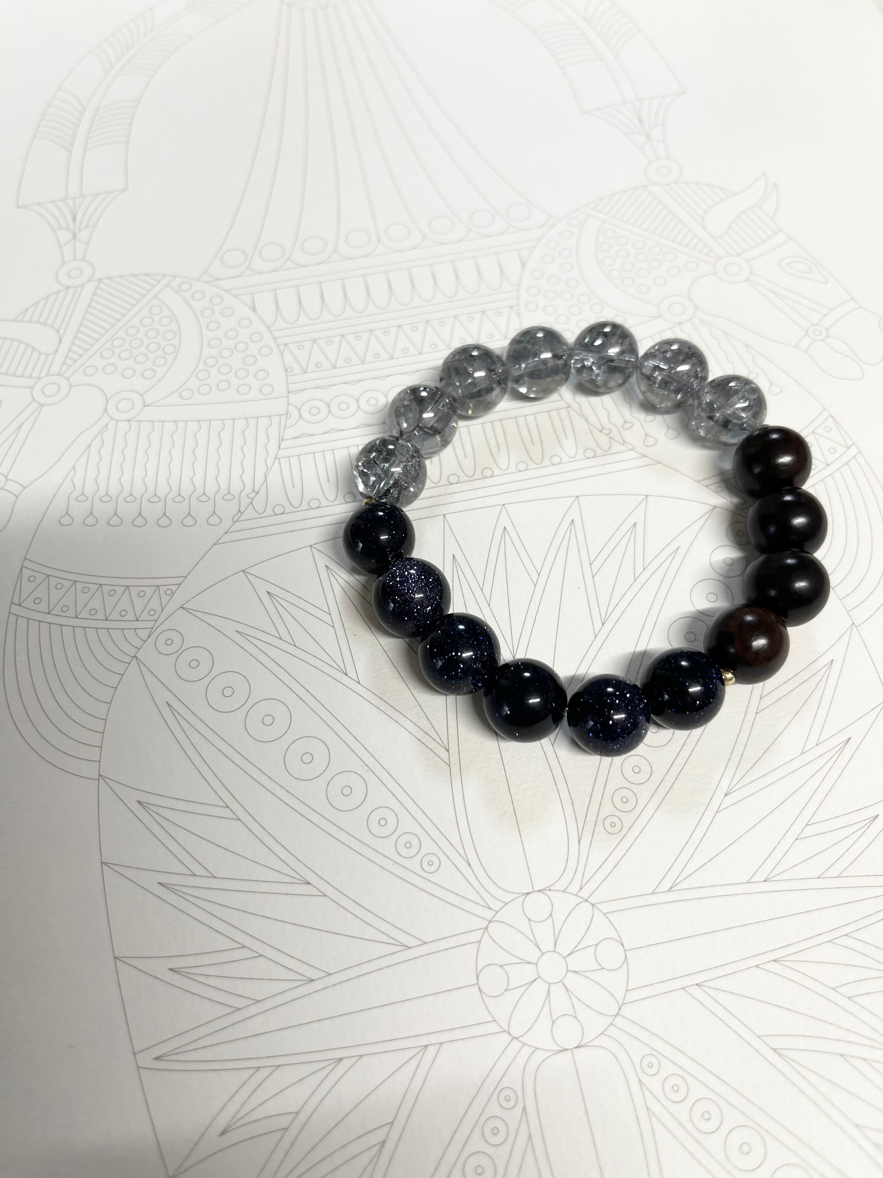 このブレスレットは、シルバークラッククリスタル、ゴールドストーン、そしてエボニーを使用しており、宇宙の神秘と星々のエネルギーを見事に表現しています。身に着けることで、日常に特別なパワーを取り入れ、心をリフレッシュさせる機会を与えてくれるでしょう。